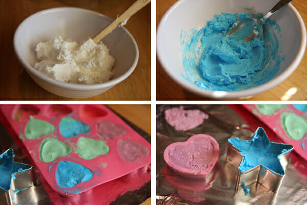Now. You have a giant blob of dried soap fluff and your kids were entertained for a total of 3.5 minutes. That’s a start! Sometimes I let my kids just take the whole darn thing in the bath tub and have at it. It’s one way to make sure they actually get cleaned in there. Or sometimes I hold it up over them in the tub and let it “snow” by smashing it and letting it sprinkle down like little snow flakes. Or, you can let them make their own little soaps. First, put the fluff in a bowl and let them do what they’ve probably been trying to do already- smash it to smithereens. It just kind of falls apart, so it’s actually kind of fun. And if it gets all over your counter, take my advice and sweep or vacuum it up first, then wipe it down. Otherwise you’ll end up with a big soapy mess.