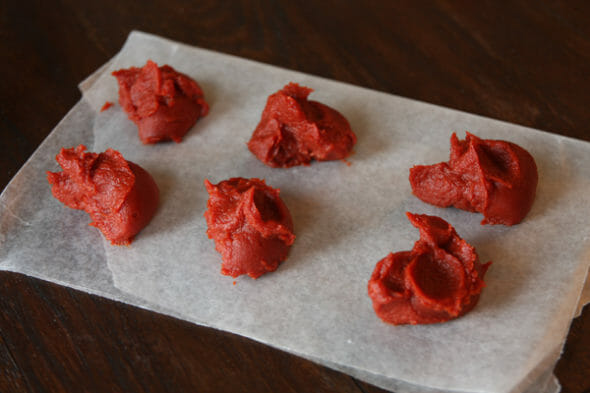 - Tomato Paste – Quick tip: It’s kind of annoying when recipes use only 1-2 tablespoons of something like tomato paste. If you’re like me, you put the rest in a container and freeze it and then end up throwing it out next time you clean out your freezer. Or the next time you need it, you need another tablespoon and now you have a big frozen block you have to chip away at. What I usually do is spoon it out into 1 tablespoon measurements, either on a piece of waxed paper like you see in the photo, or into an ice cube tray that’s been lined with plastic wrap. Once they’re frozen, place them in a zip top bag in your freezer and next time you need some, you can just grab the amount you need, all measured out and ready to go.