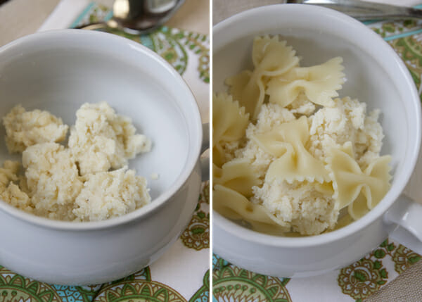 - To assemble the soup for serving, spoon a generous dollop of the cheese mixture into the bottom of the bowl and add some pasta if you cooked it separately.