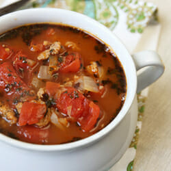 - You’ll brown up the sausage and then add in some onions and garlic, some dried herbs, a couple of bay leaves, some diced tomatoes and chicken broth, and some tomato paste.