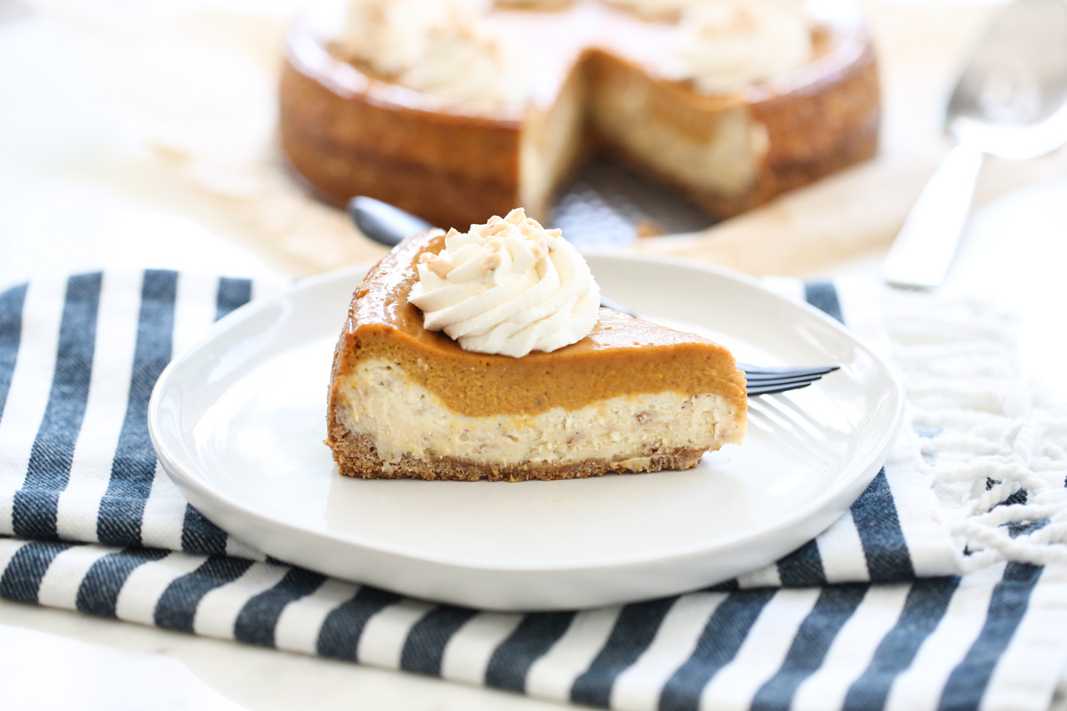 This show-stopping dessert combines two favorites: pumpkin pie and cheesecake! Not to be confused with a pumpkin flavored cheesecake, this is a layer of creamy cheesecake with toffee bits, topped with a smooth and perfectly spiced pumpkin pie. The best of both worlds! This has become a holiday tradition for so many people. Try it once and it might be your new tradition as well!