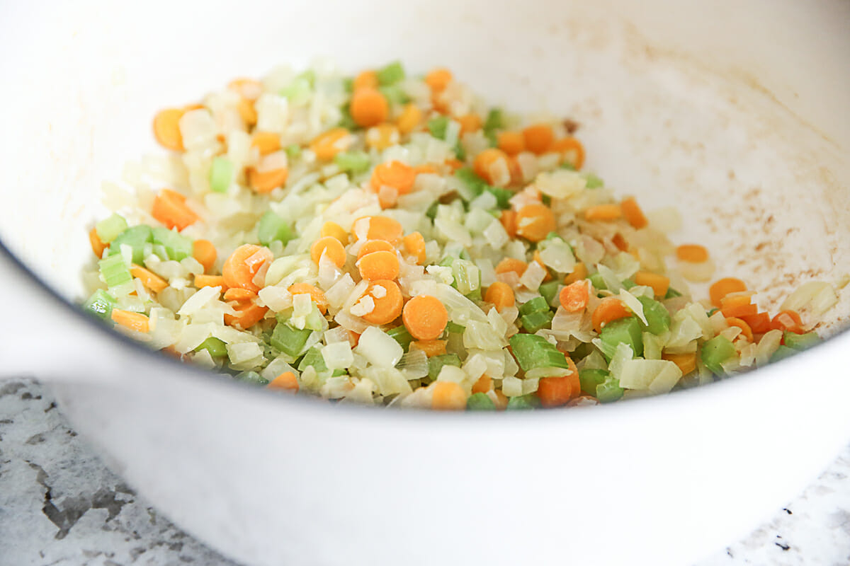 - Add a generous drizzle of olive oil or a couple pats of butter to a hot stock pot. Like most chicken soups, a quick sauté of onions, carrots, and celery provide a great flavor base. We’ll add in a few cloves of minced garlic here as well.