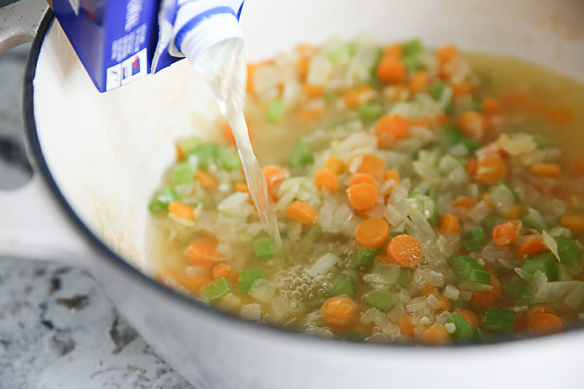 - Heat large stock pot to medium heat. Add oil or butter. Add chopped celery, carrot, and onion. Saute 3-4 minutes until tender. Add garlic and stir for 30 seconds more. Stir in salt, pepper and dill. Add broth, stirring to scrape any bits off the bottom of pot.