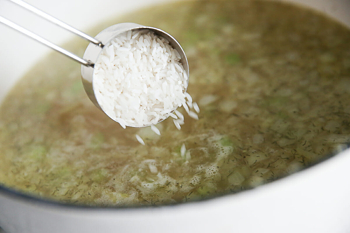 - Add rice and herbs, if using dry dill. If using fresh dill, you’ll add it at the end! The rice takes about 20 minutes of simmering to be finished.