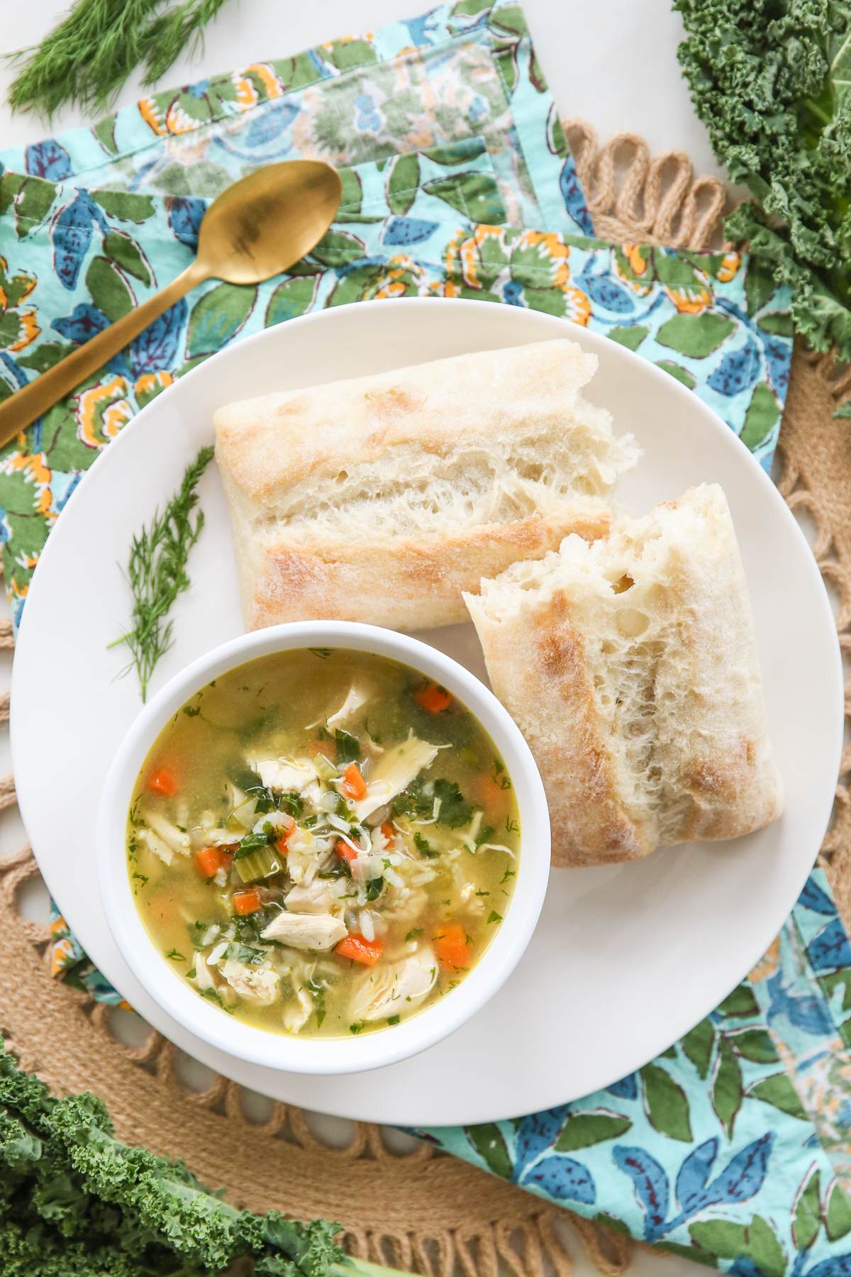 - After rice is cooked through, add chicken and kale and stir for 1-2 minutes until chicken is heated through and kale is wilted. Remove soup from heat and stir in zest and lemon juice to taste. Also add dill if using fresh dill.