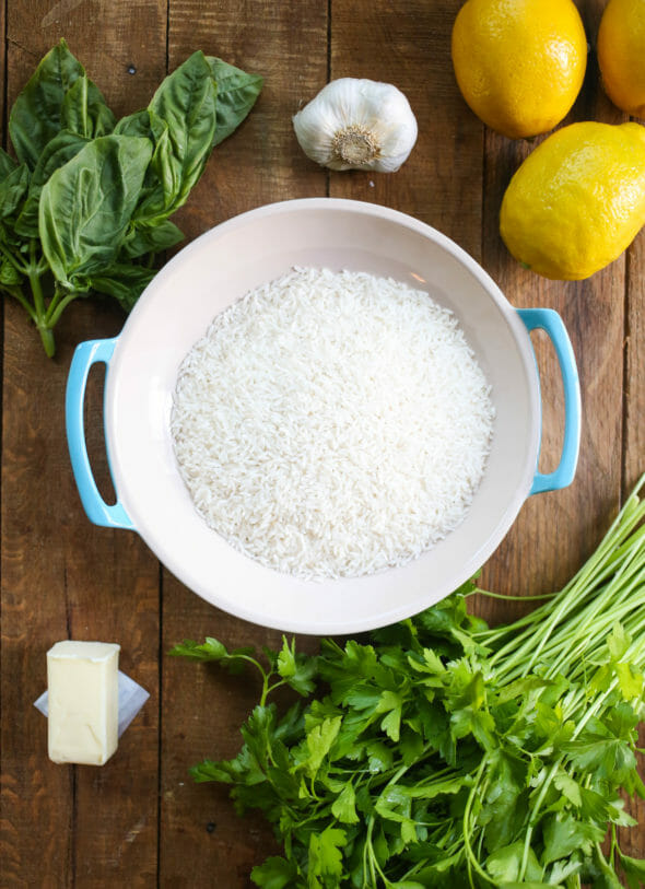 You’ll need long-grain rice, lemons, garlic, a handful of fresh Italian herbs (like parsley, basil, rosemary, marjoram, thyme, oregano–I recommend 1/2 parsley and 1/2 whatever else you want to use), butter, and salt and pepper.