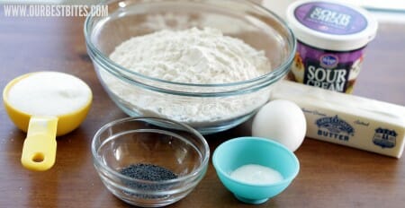 First, place the oven rack on the lower-middle position (unless your oven bakes hot like mine does or not hot, like mine doesn’t–then use your pretty brain to figure out where it should go. Mine needs to go in the middle). You’ll need 2 cups of flour, lightly spooned into measuring cups and leveled with a knife, sugar, baking soda, baking powder, salt, frozen butter, sour cream, an egg, lemon zest, and poppy seeds.