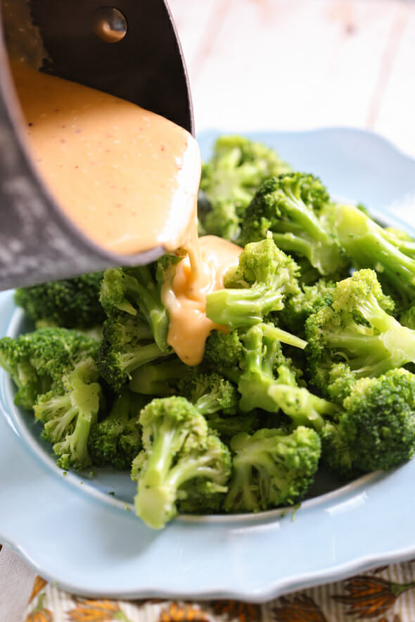 This Lightened-Up Cheese sauce is a great way to get your kids (or yourself) excited about eating veggies! It’s also great over noodles, zoodles, baked potatoes, or used as a dip for tortilla chips or your favorite fondue dippers. I love cheese sauces, but they are typically not that great as far as calories and ingredients go. This lightened-up version is full of real ingredients that you shouldn’t feel any guilt over! The original recipe is from America’s Test Kitchen Comfort Food Makeovers, but I made a few very minor tweaks, all relating to using better cheese for the best flavor and sauce possible (I think we can all agree to leave low-fat cheese in the 1990s, yes?). The end product is a deliciously smooth, healthier cheese sauce that you’ll come back to again and again.