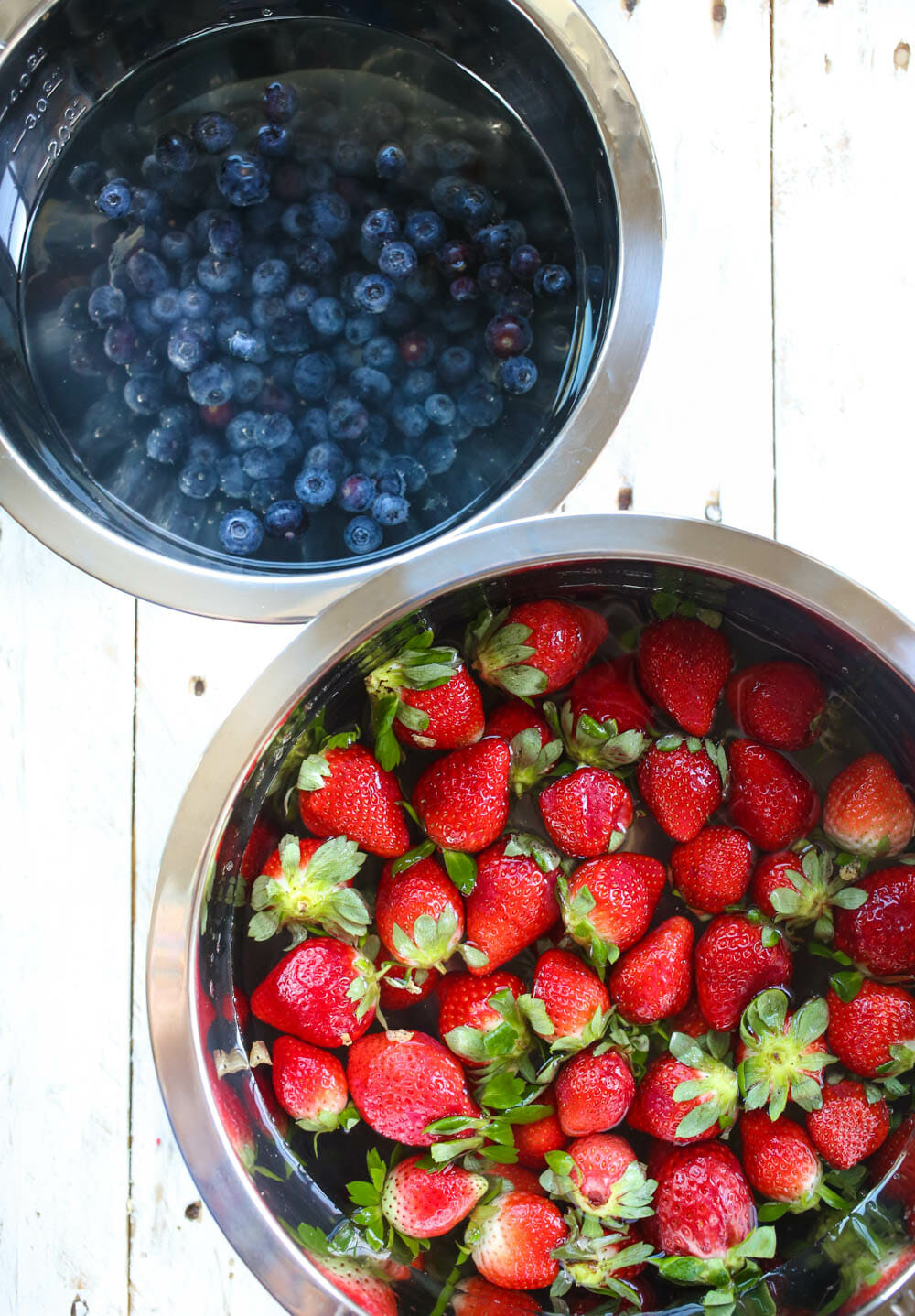 - Place berries in a bowl (either together or separate, depending on how you want to use them). Add 1-2 tablespoons vinegar per bowl, then fill with lukewarm water. Agitate gently, then allow to stand for 20 minutes, agitating every 5 minutes or so. Drain and rinse, then store in an airtight container or ziploc bag.