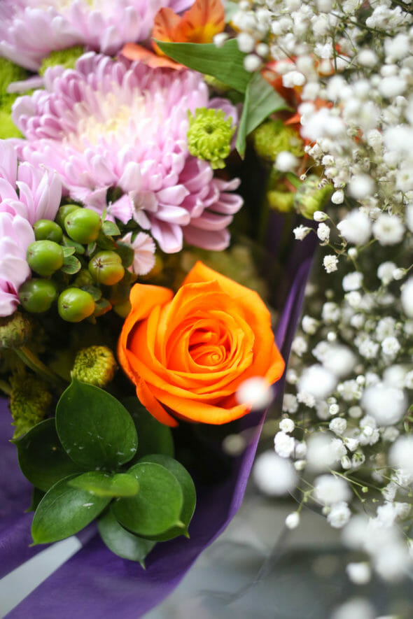 When I bought flowers for my daughter’s flower crown, I just grabbed a pretty bouquet with some good variety at the grocery store, plus some greenery. There’s no need to get all fancy. You’ll want sturdy flowers–no tulips or poppies, sadly. For this tutorial, I grabbed two bouquets from the discount section at Kroger (I made sure they were pretty…I wouldn’t have bought them if they looked like they were dying), plus some sunflowers, a couple bunches of different colors of of hypericum berries, green pompoms, white and purple stock, and baby’s breath.