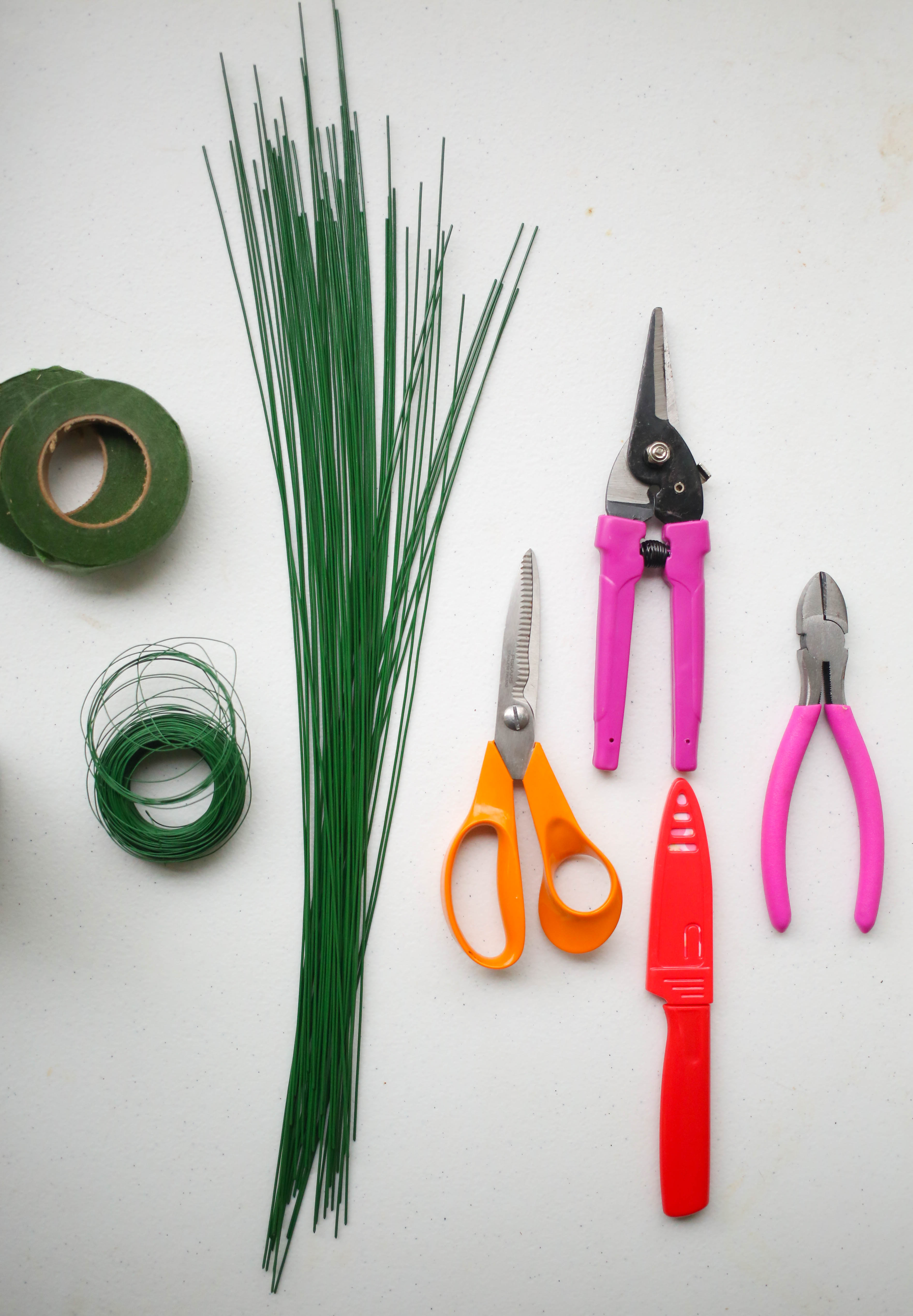 For sure, you’re going to need wire cutters, floral shears (I actually bought mine in a set on Hobby Lobby, and they’re really not anything fancy at ALL, but they got the job done). You’ll also need some heavier gauge wire to make the crown (I used 18 gauge–the smaller the number, the thicker the wire), lighter gauge wire to attach the flowers (I used 22 gauge), and floral tape. You also might want to have a sturdy pair of scissors, a small, sharp knife, and a drink handy. Because Diet Coke.
