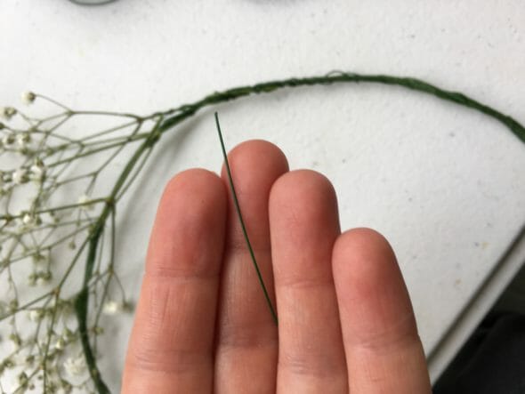 If you’re using delicate flowers (like this baby’s breath crown I’m making), you don’t need to add wire to the stem–just wrap the small piece of wire near the base of the flowers, then add another small bunch of baby’s breath, covering up the stem that you’ve wrapped, so you’re wrapping segments of flowers every few inches. If things get overly pokey, try bending the wires down and, if necessary, wrapping with floral tape.