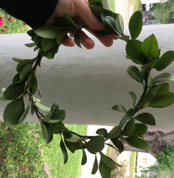 Now. If you’re not using flowers all the way around, you’ll want to start making a crown of pretty greenery. You’ll want to do the same technique I used with the baby’s breath–just attach it every few inches.