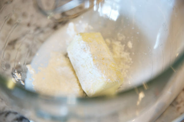 - Beat softened butter and powdered sugar until smooth.