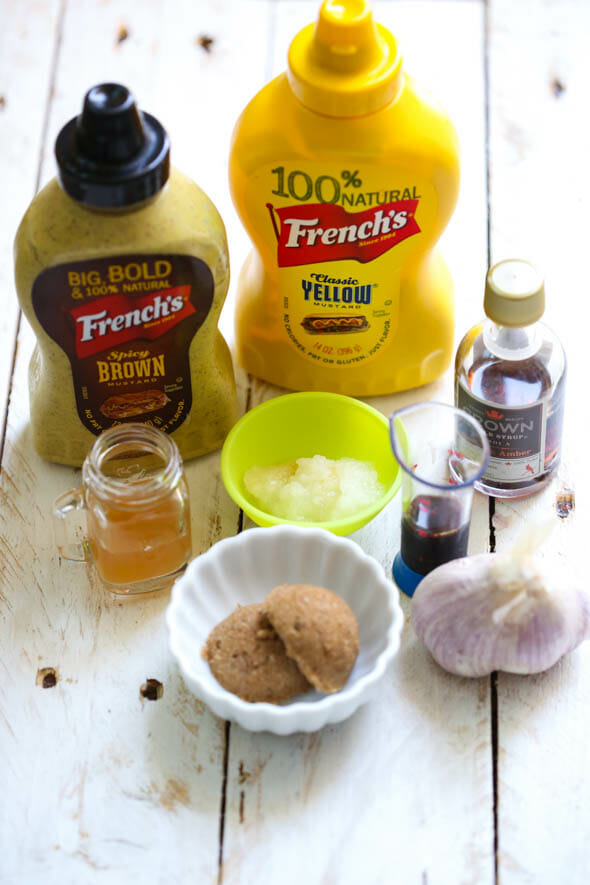 - In a small bowl, combine some spicy brown mustard, yellow mustard, brown sugar, maple syrup, grated onion, apple cider vinegar, soy sauce, black pepper, and minced garlic.