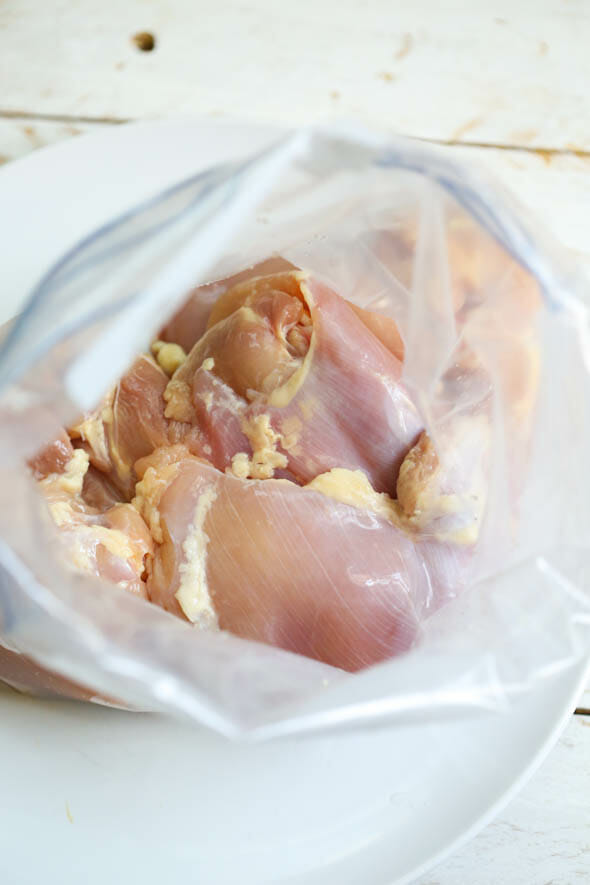 - Place the trimmed chicken thighs in a large Ziploc bag.