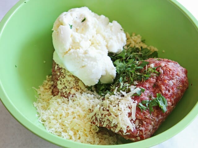 To make the meatballs, you’ll need lean ground beef, spicy pork sausage, dehydrated onion, minced garlic (1/4 cup! Hello, lover!), fresh thyme, fresh parsley, fresh oregano, an egg, grated fresh Parmesan, Italian-seasoned breadcrumbs, ricotta cheese, and kosher salt.