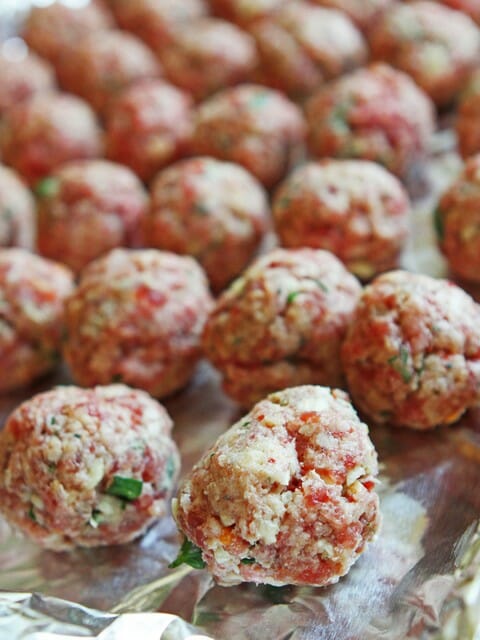 *I swapped out the fresh onion for dehydrated onion; after making many, many meatballs in my days, I’ve found this keeps the meatballs easy to work with without adding unnecessary filler to bind them together.