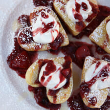 - While those are baking, whip up your quick berry sauce. Just mix up a few frozen berries and a few tablespoons of whatever berry jam you have in the fridge. Heat it in the microwave for a bit and then mash it all together with a fork, adding sugar if needed. The jam sweetens and gives body to the sauce and the berries make it taste like it’s fresh. It’s so easy; I use this for ice cream, pancakes, waffles, and all kinds of stuff like that.