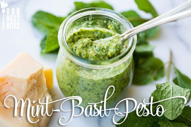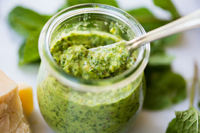 Sometimes traditional basil is a little heavy for me, and I’m not a huge fan of pine nuts, but the mint here isn’t super minty, it just brightens up that strong basil flavor. It’s delicious on pasta, pizza, garlic bread, spread on flank steak or pork tenderloin and grilled, anything with a little Mediterranean flair.