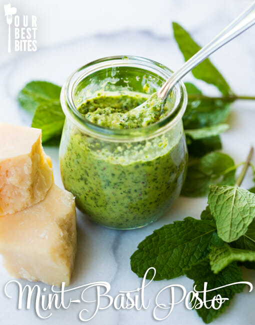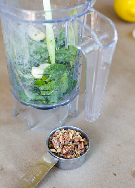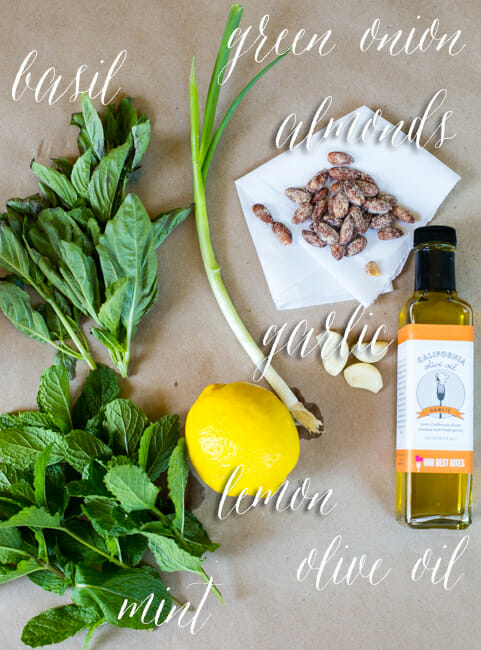 You’re going to need fresh mint leaves, fresh basil leaves, toasted almonds, garlic, a green onion, fresh lemon zest and juice, freshly grated Parmesan, and extra-virgin olive oil (I used Our Best Bites Garlic Olive Oil, which is still on sale if you haven’t snagged any yet!)