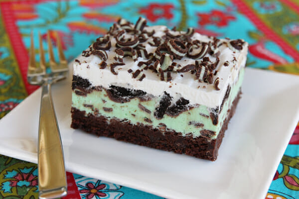 My love of peppermint and chocolate goes back a long way and this is one of my favorite ways to enjoy that combo. These Mint-Chip Ice Cream Brownie Squares are kind of an ice cream version of my most favorite brownies (have you made those yet?? ). It has layers of brownie, mint-chip ice cream, chocolate ganache, Oreo cookies, whipped topping, and Andes chocolate curls. This is one of my favorite desserts to make for a crowd because it makes a big ol’ pan, and you can prepare it several days ahead of time. Also, people will suddenly worship you after they eat it, and that’s pretty awesome too.