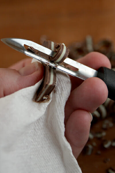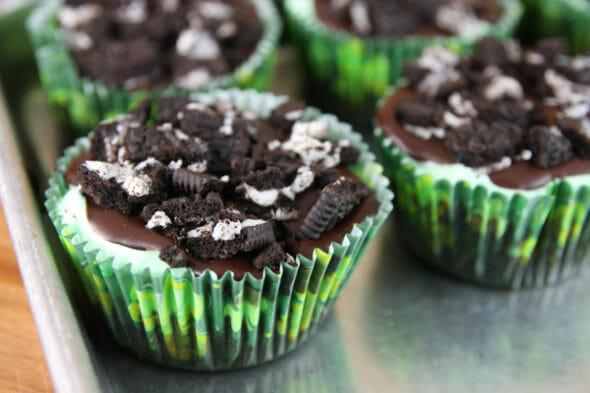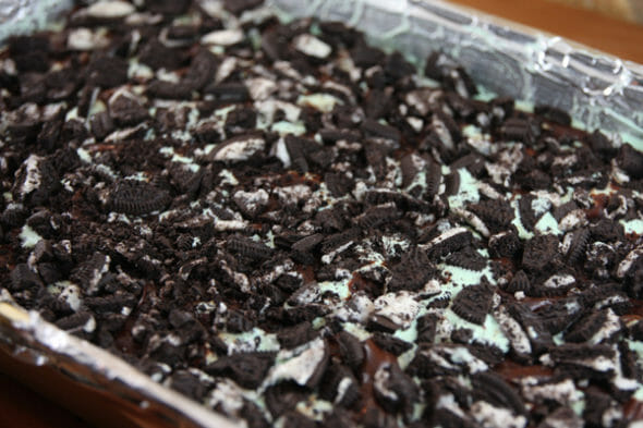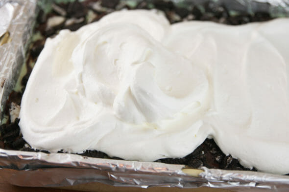 - Crush up some Oreos and press them into the ganache layer, then top everything with whipped topping (tinted with green food coloring, if desired). To finished things off, I like adding some Andes mint shavings with a vegetable peeler. Chocolate curls or sprinkles work well here, too.