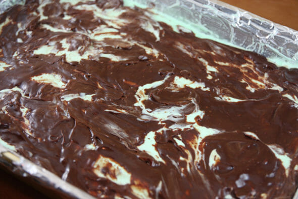 - Whisk in peppermint extract and let chocolate mixture cool to close to room temperature. Drizzle in an even layer over ice cream layer in pan.
