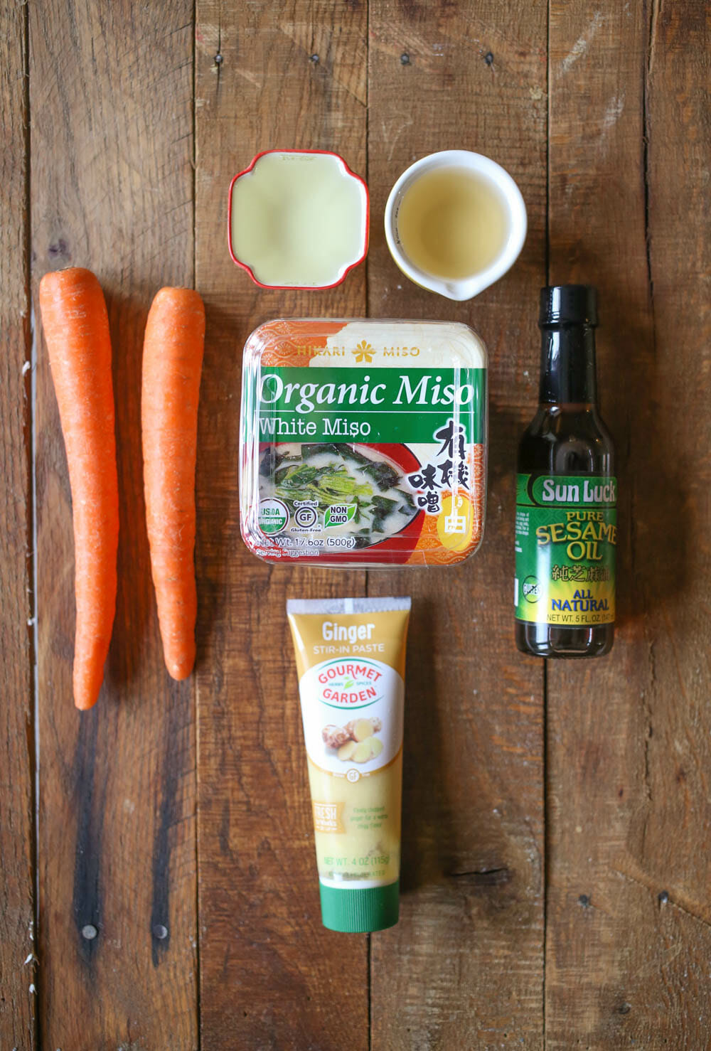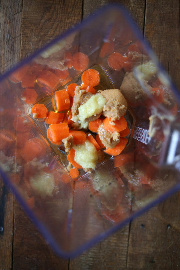 - Peel and roughly chop the carrots. Place the carrots, ginger, oils, vinegar, and miso in the jar of your blender and blend until smooth.