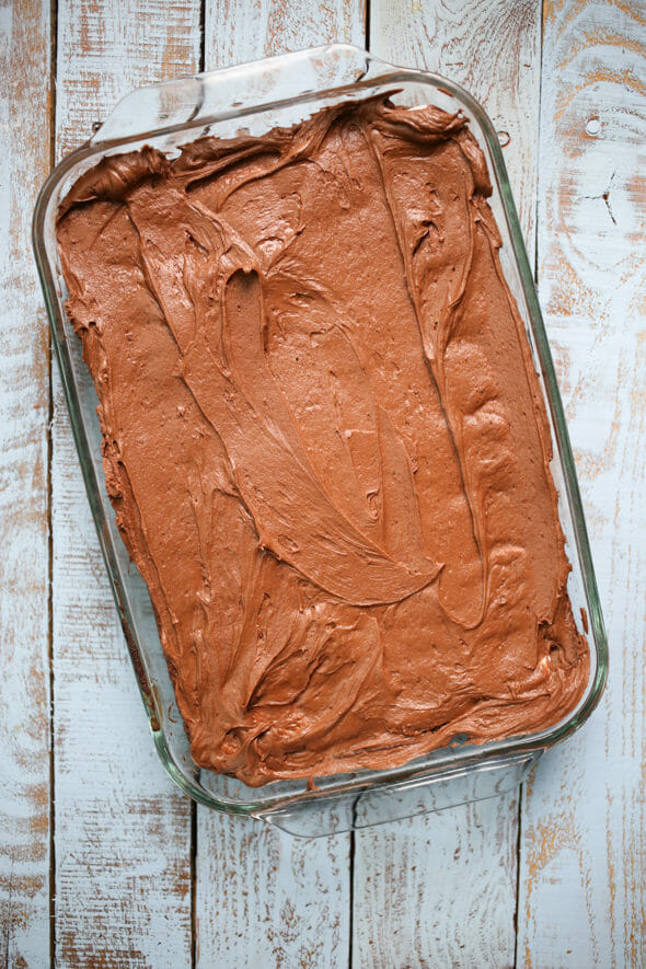 - While the brownies are cooling, beat together the frosting ingredients on high speed until light and fluffy. Spread over the cooled brownies and cut into squares. (Using a disposable knife works very well if you have one around.)