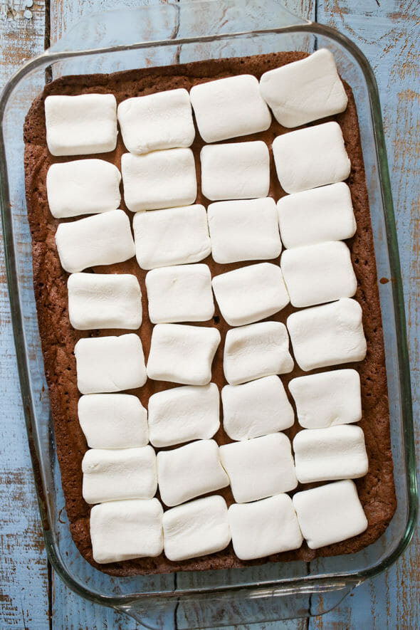 - When the brownies are done, remove from the oven and spread the marshmallows on top. Return the pan to the oven for 2-3 minutes or until the marshmallows are puffed. Remove from oven and cool completely.