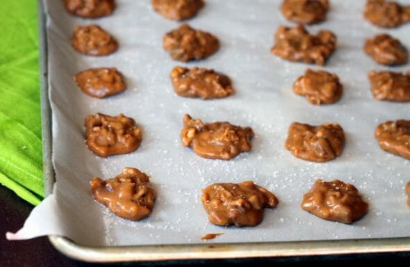 - Using two dessert spoons or a half-tablespoon cookie scoop, spoon the pralines onto the lined baking sheets. If desired, lightly sprinkle with kosher salt.
