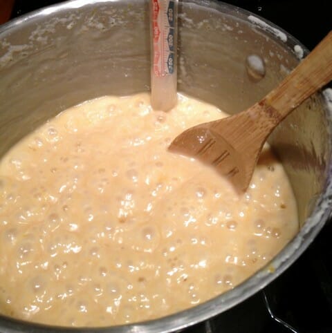 - When the mixture starts to thicken, start stirring constantly. The mixture will gradually turn golden brown and become thick and bubbly.