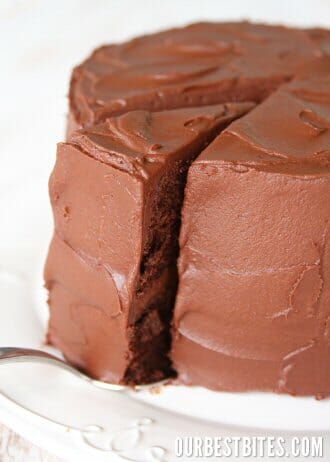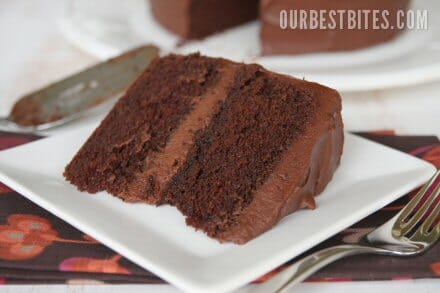 I’m pretty sure something biological happened to me about the same time I became a mother. At least that’s when I remember it happening. That was the point when I realized I couldn’t live without chocolate. I found myself thinking about chocolate, craving chocolate, scouring my pantry for spare chocolate chips that may have fallen out of a bag at some point and landed in some random corner. And I wouldn’t by any means call myself a chocolate snob (because I’m pretty sure anyone who makes that proclamation wouldn’t be on their hands and knees in the pantry looking for old chocolate chips) but I do have an appreciation for quality chocolate. And I don’t like it overloaded with sugar- the darker the better in my book. I even love bittersweet chocolate. But when it comes down to it, if it’s got chocolate in it- I’m down. So needless to say, a chocolate cake with chocolate frosting pretty much rocks my world.