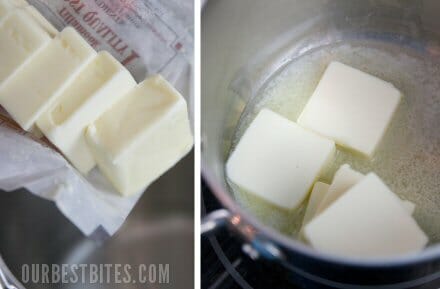 After the chocolate is melted, set the bowl aside and dump out the water that was in the pan. Now you’ve already got a warm pan for the next step (butter melting). Remember that when you read the recipe and it tells you to use 2 pans. I’m all about one less dish to have sitting in my sink for days wash.