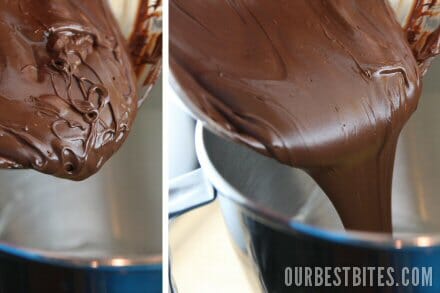 You’ll stir this all together and have sort of a chocolate sauce consistency. Place your bowl in a bowl of ice to bring the temperature down, and just keep stirring until the mixture starts hardening against the side of the bowl. Then you can pop the paddle attachment on your mixer and start whipping. Magically it turns thick and fluffy.