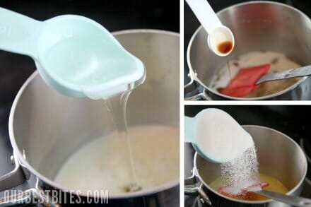 To the melted butter, you’ll add a little corn syrup, vanilla, and granulated sugar.