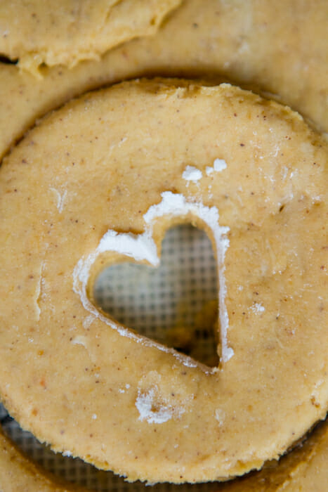- Re-roll the dough gently as needed until it’s all used up. Use a small cookie cutter to cut a hole in the center of each doughnut.