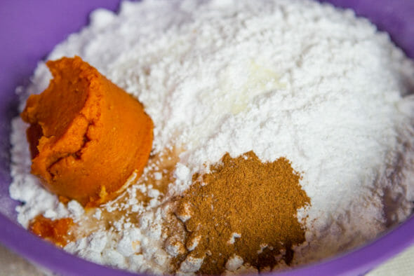 - Before frying the doughnuts, make the glaze. In a medium bowl, mix powdered sugar, corn syrup, salt, pumpkin pie spice, canned pumpkin and vanilla.