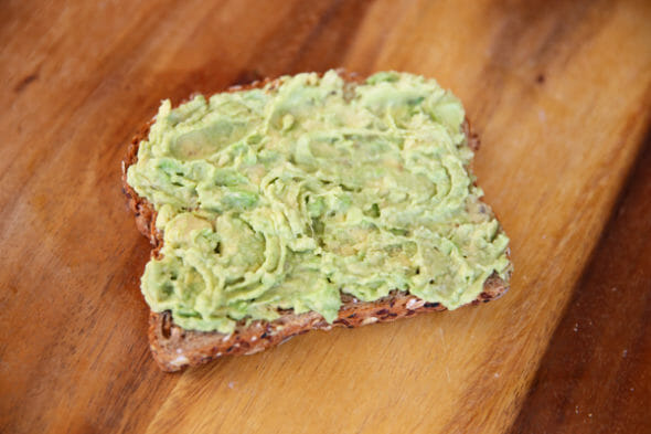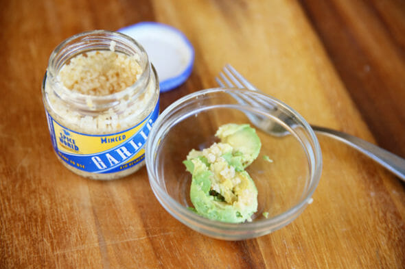 - Pop your bread in the toaster. While that’s going, mash up a little avocado. I like to add some jarred garlic to my avocado, along with a pinch of salt, but that’s optional. Spread that onto your toasted bread.