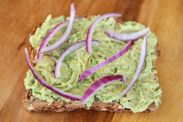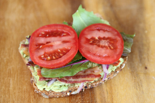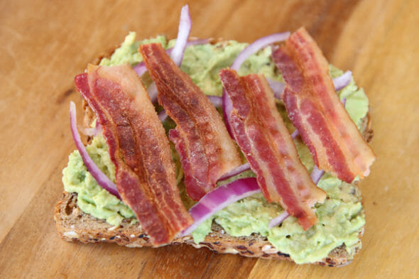 - Toast bread. Mash avocado with garlic and spread on bread. Place bacon and onion slices on top of avocado. Top with greens, sliced tomato and egg. Sprinkle with salt and pepper. Serves 1.