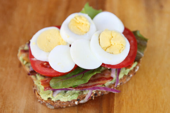 Many of us get stuck in the lunch time rut- especially if you’re a stay at home Mom and find yourself snacking on your toddler’s food or not even taking the time to eat a real meal. I know it’s sometimes challenging because you don’t want to take the time and effort to actually cook a meal just for yourself, so I’ve been sharing more and more of my quick fix meals for one, like this Open-Faced Avocado-Egg BLT. It’s quick and easy to toss together and has some real staying power to get you through that afternoon rut! When you keep your fridge stocked with a few basic things, you can create really quality, healthy, filling, meals in just a few minutes. Some other examples are this Healthy Thai Chicken Salad for 1, Eggs on Toast with Creamy Spinach Sauce, and our popular Bruschetta Chicken Pesto Wraps. You’ve asked for more, so here go. (Ask me for cookies and I’ll deliver those as well. I’m nice like that.) This lunch has been one of my favorites lately; I’ve actually eaten it for lunch every day this week!