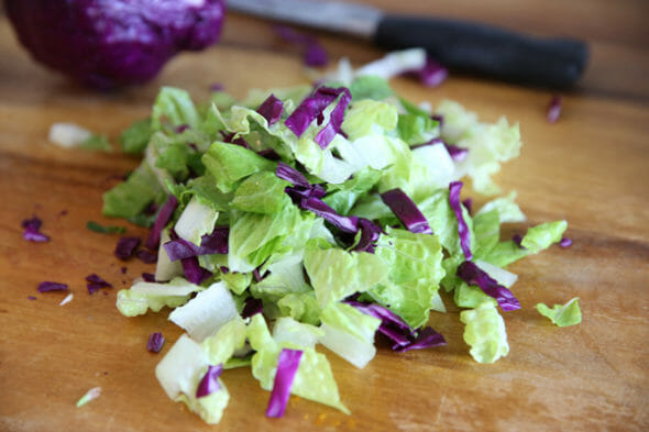 4. You can also chop up the green onions that you started using for the dressing, and also some sliced cucumber. When it comes to carrots, sliced carrots are way to thick and crunchy, but shredded or shaved carrots seem to thin and weak.  I’ve found a perfect happy medium with a cheese slicer.  It’s a little thicker than a vegetable peeler, but thinner than my knife skills, so it works beautifully.  I just take long slices, and chop them into shorter pieces.