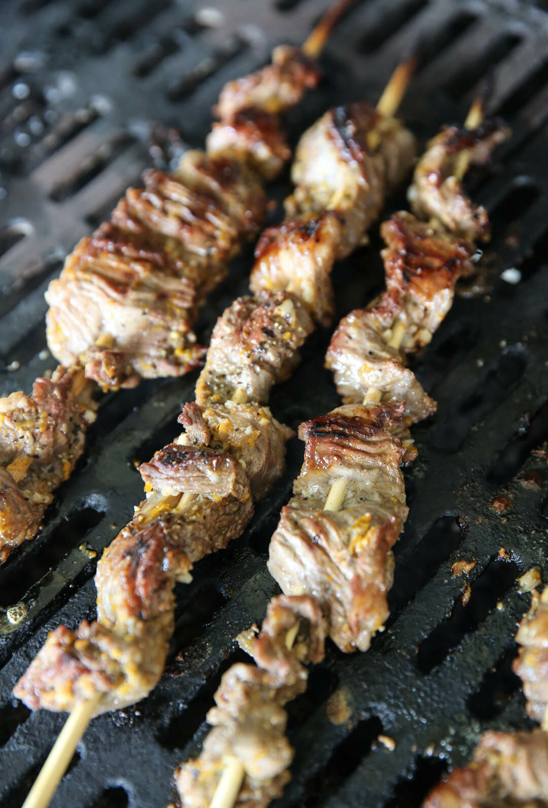 - When you’re ready to get cooking preheat your grill. Then take your skewers (pre-soaked if you’re using wood/bamboo ones) and thread on the strips of meat, just like you’re stitching. You don’t want them to be too smushed on there. In order for them to cook evenly, stretch the meat out a bit.