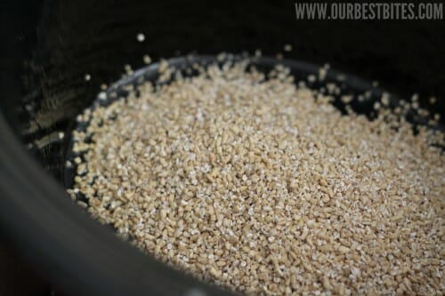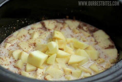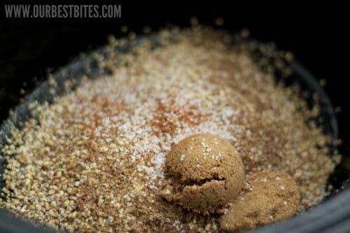 So spray the slow cooker (well, the removable crock part, not the whole slow cooker–I know 99.9% of you are smart enough to realize that, but that darn .1% ruins it for everyone) with non-stick cooking spray and place the oats, brown sugar, ground flax, and cinnamon in a 3 1/2 quart slow cooker. You can go larger–a slow cooker up to 6 1/2 quart is fine–but don’t use the biggest, baddest slow cookers out there.