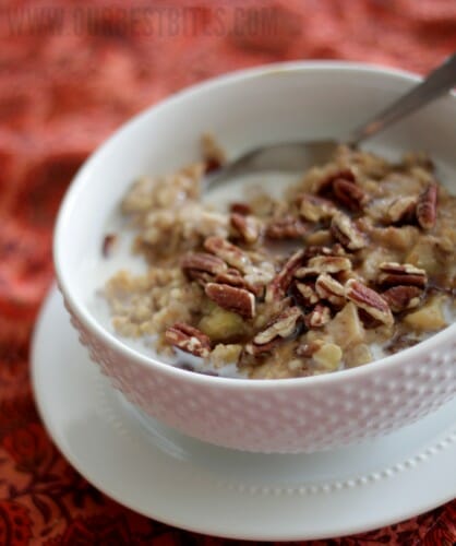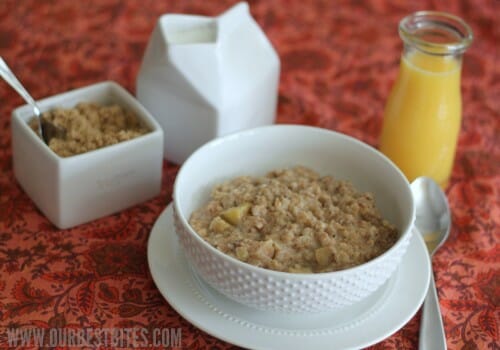 I have a rice cooker that I can set a timer on so I throw it in before bed and it’s all ready in the morning (in fact, I’m eating it right now!). I usually throw in honey and almond milk, but apple cinnamon is yumm-y!