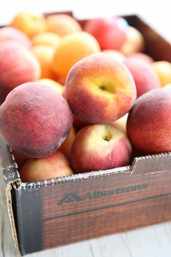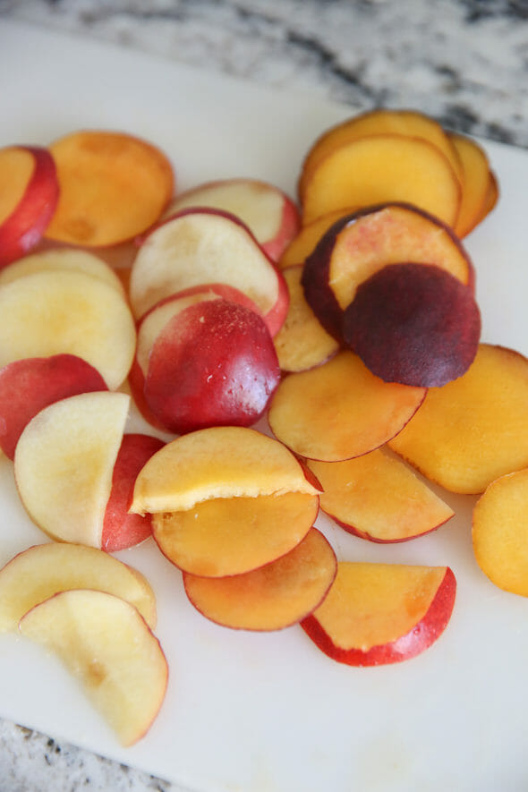 - First, slice your peaches. I don’t worry about peeling, or pitting my peaches. I feel like both of those things cause the peaches to kind of fall apart, so I cut them in slices starting from the outer edge, until I get to the pit, and then doing the other side and slicing off any extra for snacking.