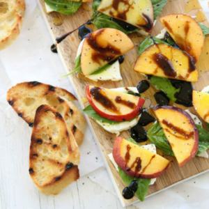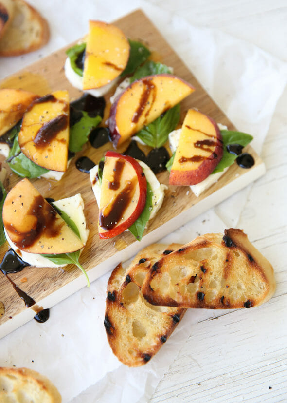 - You could also turn this into bite-sized finger food by using the mozzarella balls and threading onto little skewers. When I make them this way, I place mozzarella balls and peach chunks in a bowl and toss them all with olive oil, salt and pepper. If you’ve got time, you can do that part ahead and just let them marinate. After they’re skewered I drizzle with balsamic. However you make them, you should definitely try this while peaches are in season!