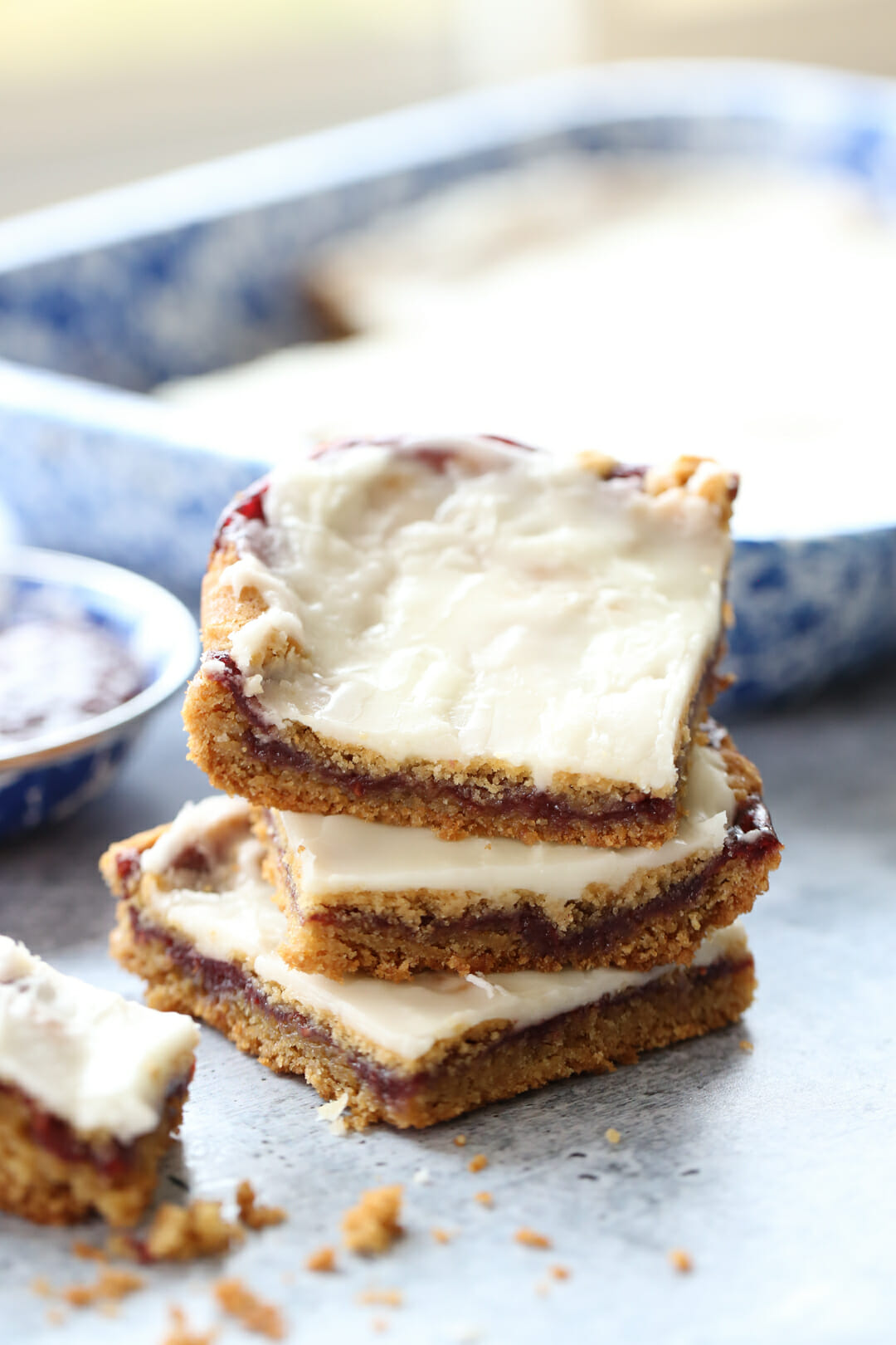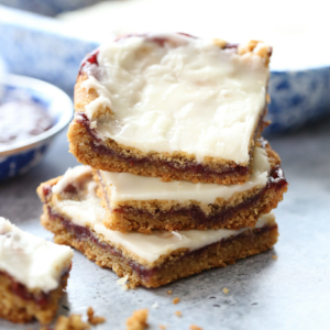 Peanut Butter and Jelly is one of the world’s best flavor combinations. These cookie bars are a family favorite and taking one bite into these blissfully sweet bars is like taking a big chomp into my childhood. We made these a lot growing up. In fact, I can still visualize the paper my Mom had with the recipe and a note that it was from our neighbor down the street, Sharon Mckenzie. They were a regular addition to summer pot-lucks, Christmas plates for neighbors, our weekly “Family Nights” and on lazy Sunday afternoons. It’s basically 2 layers of super soft peanut butter cookie dough sandwiching a layer of sweet berry jam, with a creamy, buttery vanilla glaze on top.