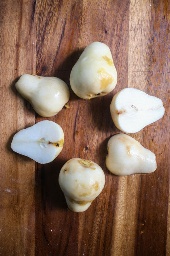 - pears – you’ll need about 3 medium, and you can feel them if you want. Pear skins are so thin that they’re pretty unobtrusive. To peel them super easily, bring a pot of water to a boil and fill another bowl with ice water. When the water is boiling, drop the pears in it for 20 seconds, then plunge them into the ice water and their skins slide right off. Then you just cut out the core and chop them up!